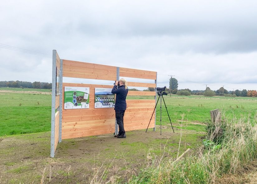 Kleve, Oktober 2025 – Wer gerne Vögel beobachtet oder einfach einmal in die Weite der Düffel blicken möchte, kann sich jetzt auf ein besonderes Naturerlebnis freuen: Am Reyerbruch, nördlich von Kranenburg an der Alde Börg, hat die NABU-Naturschutzstation Niederrhein im Rahmen des EU-LIFE Projektes „Grünland für Wiesenvögel“ einen neuen Aussichtspunkt mit Sichtschutzwand und Infotafeln eingerichtet. Das Projekt, das durch die NABU-Naturschutzstation Niederrhein e. V. in der Düffel umgesetzt wird, ist nicht nur ein Gewinn für die Wiesenvögel, sondern genauso auch für die Menschen vor Ort. Sie bekommen mit dem neuen Aussichtspunkt die Möglichkeit, die Natur in der Düffel zu beobachten, ohne rastende Vögel aufzuschrecken. Ein Naturerlebnis, dass sich zu jeder Jahreszeit lohnt.